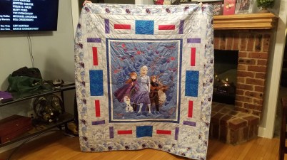 Made this quilt for my niece who is 11 years old and having health issues. She likes Frozen, the movies, so that’s what I made her.
